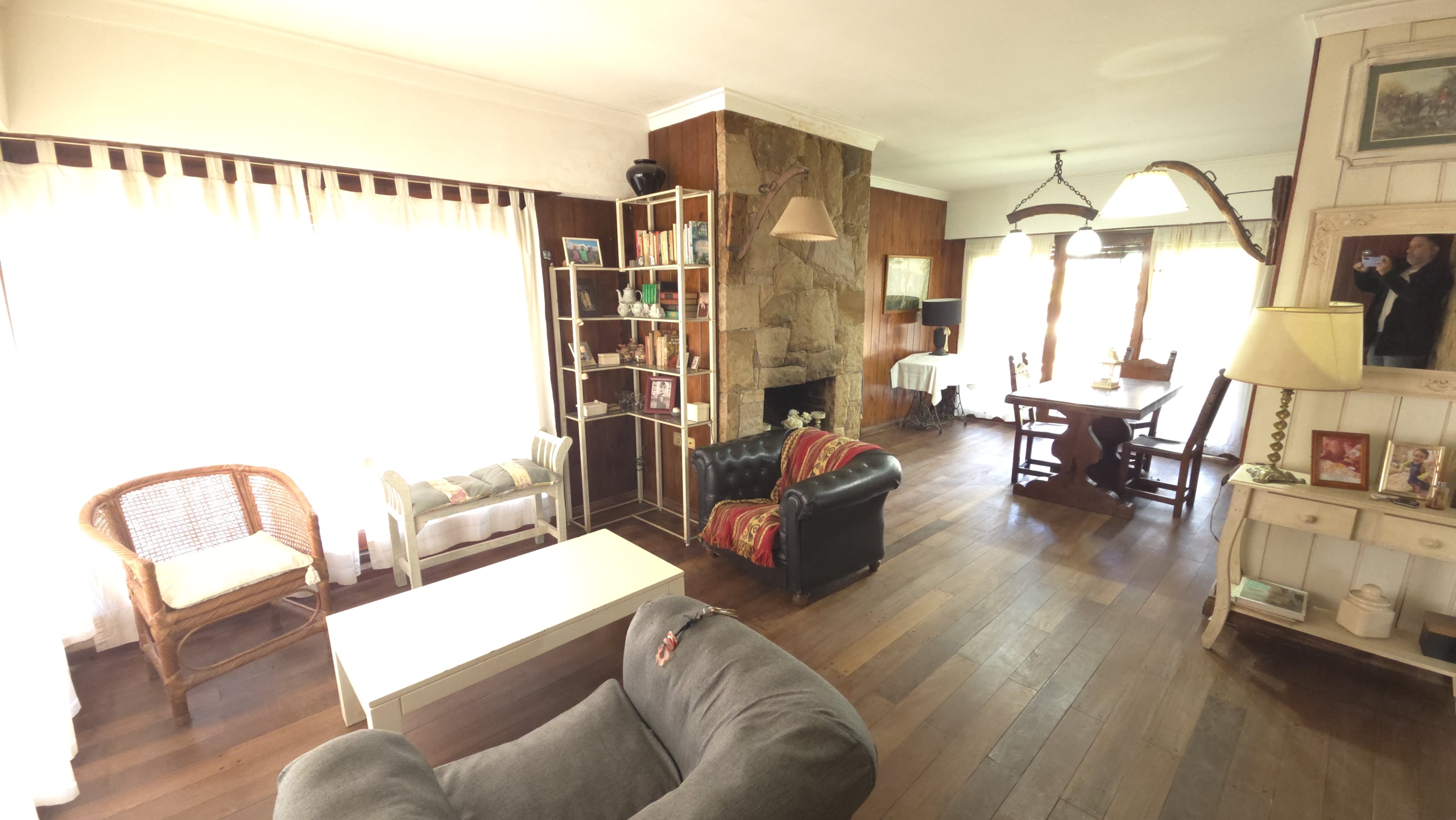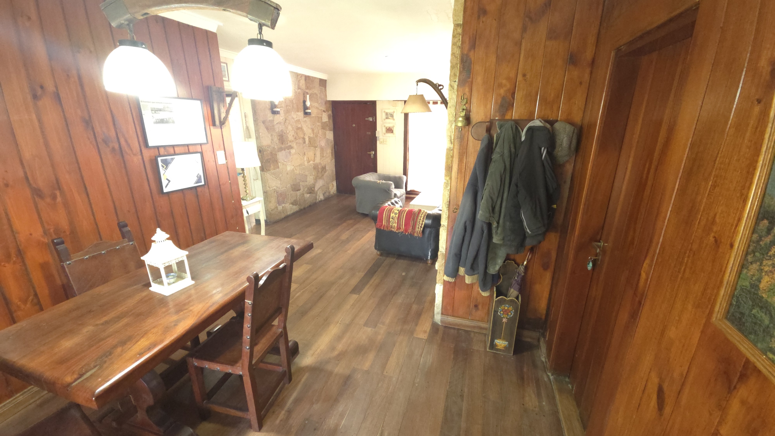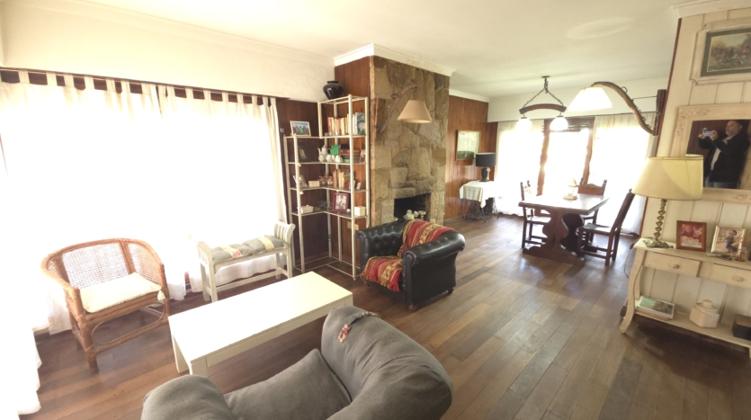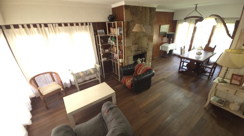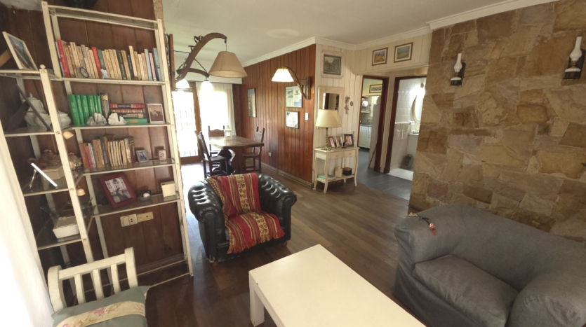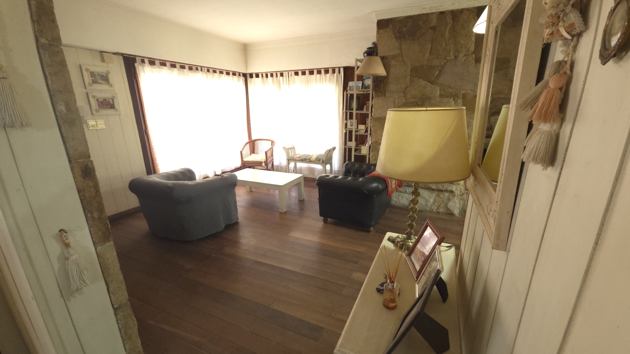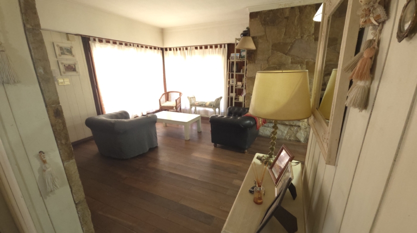 Living con piso de madera tarugado pulido y detalles en piedra Mar del Plata