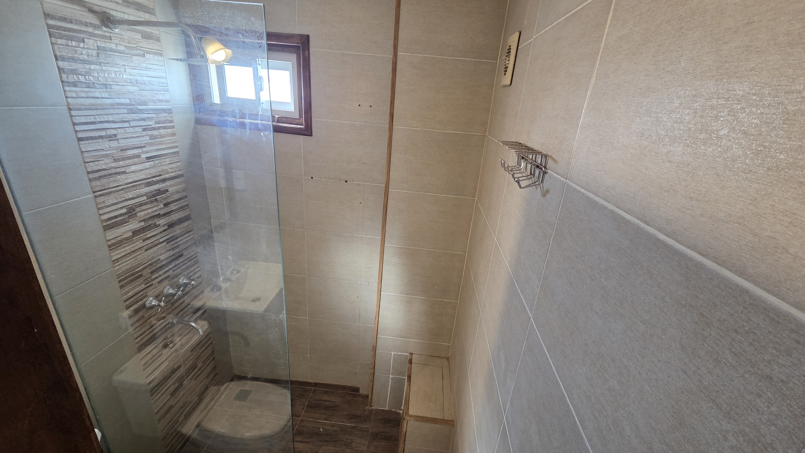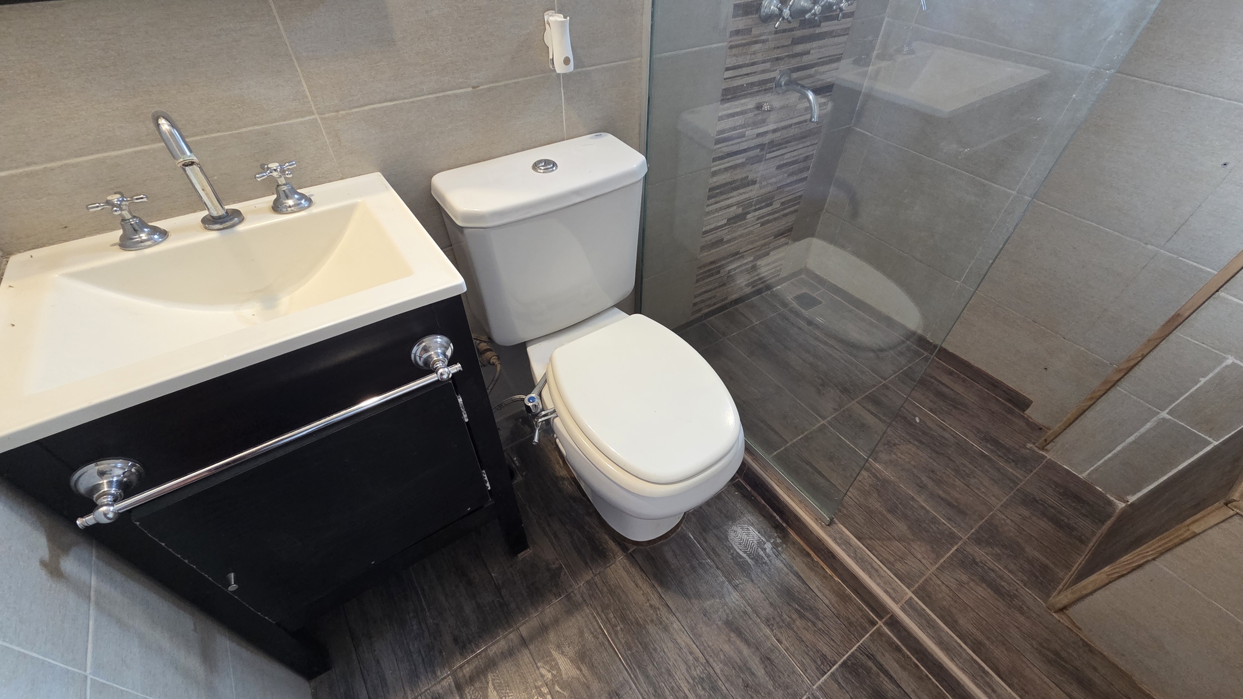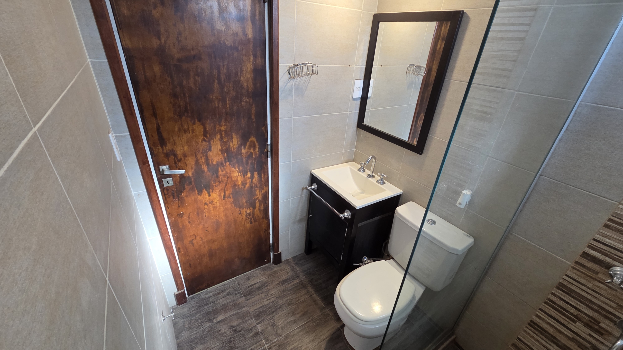 Baño completo con ventilación natural, box de ducha con mampara, revestimientos modernos y excelente terminación